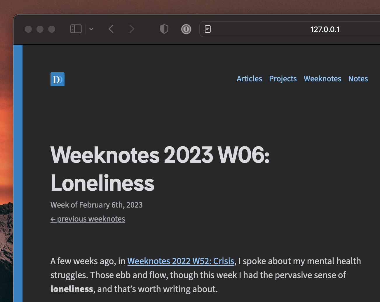 I’ve been reflecting more on loneliness, continuing from Weeknotes 2023 W06: Loneliness, specifically on connectedness in the age of the Internet.